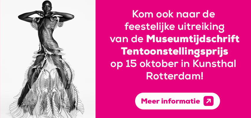 De winnaar van de Museumtijdschrift Tentoonstellingsprijs 2025 wordt op woensdag 15 oktober bekendgemaakt in Kunsthal Rotterdam (winnaar vorige editie). Kom naar deze bijzondere inspirerende middag vol kunst, ontmoeting en gezelligheid. € 15,00 Bestel hier