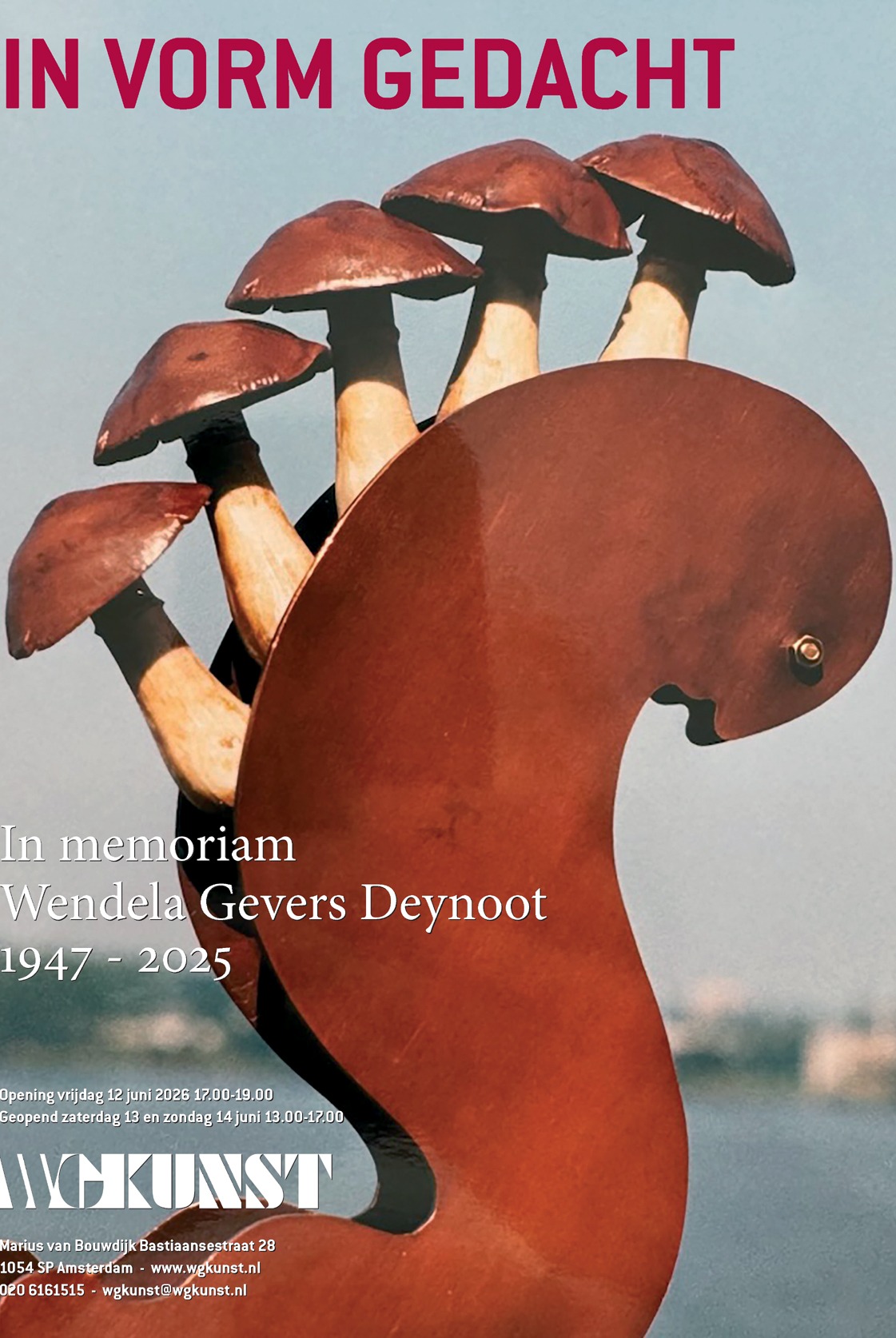 In het weekend van 12 t/m 14 juni wordt in WG Kunst in Amsterdam een overzicht van klein beeldend werk getoond van de vorig jaar overleden beeldhouwer en installatiekunstenaar Wendela Gevers Deynoot. Zij studeerde aan de Gerrit Rietveld Academie, afdeling Beeldhouwen en Architectonische Vormgeving. Haar beelden staan in de openbare ruimte, o.a. in Amsterdam, Leiden, Utrecht, Wassenaar en Zwolle.