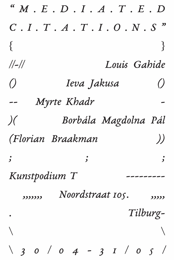Mediated Citations brengt een groep kunstenaars samen die zich bezighoudt met de presentatie en het behoud van materiaal. In een tijd waarin vragen over het verleden even urgent zijn als vragen over de toekomst, lijkt het heden ongelijkmatig, onvrijwillig en mogelijk onsamenhangend.