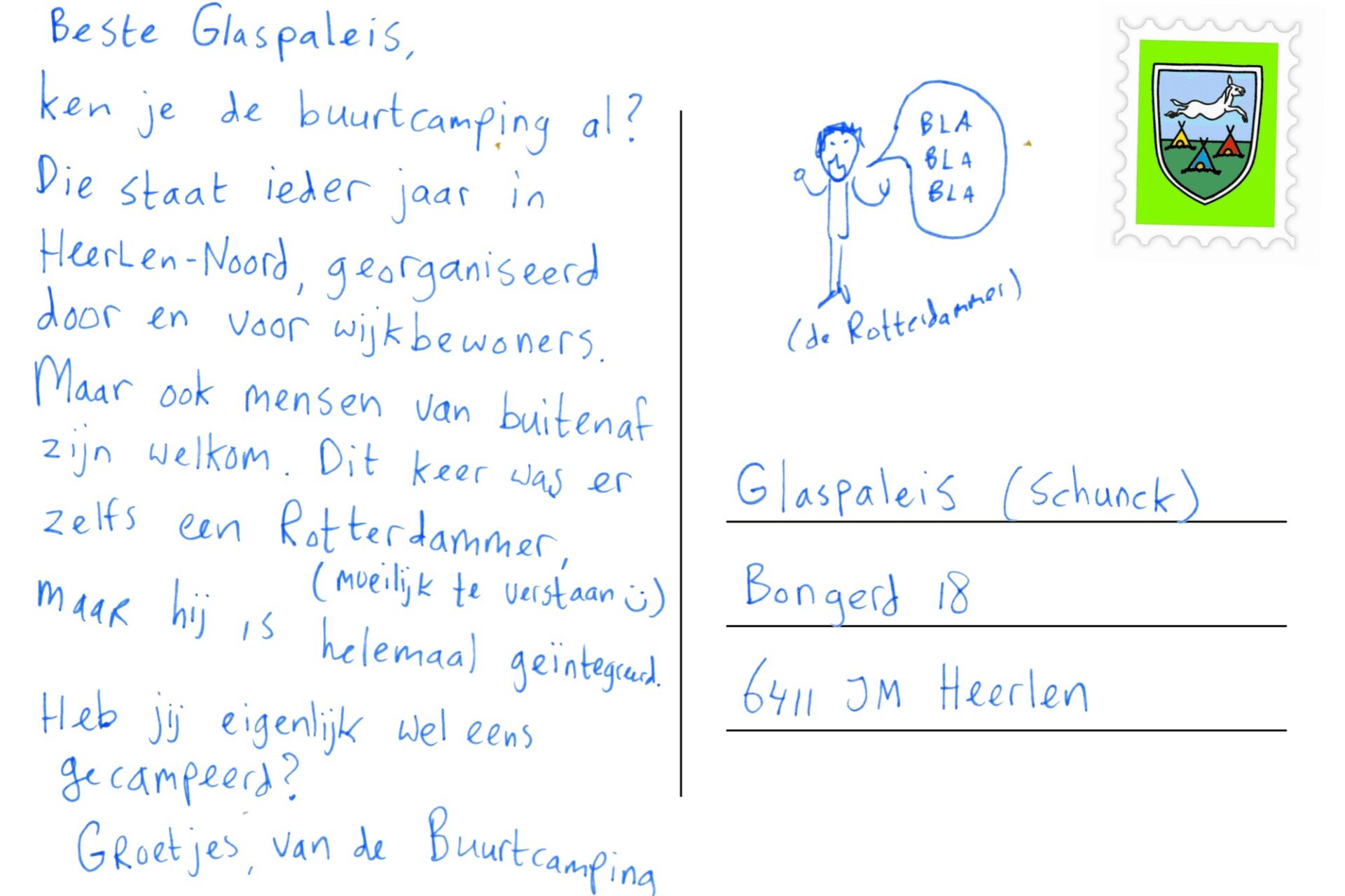 Kunstenaar Maarten Bel neemt de vitrine van SCHUNCK over. Zijn presentatie start bij het kampeeravontuur op de Buurtcamping in Heerlen-Noord afgelopen zomer. Foto’s en herinneringen van dat weekend zijn omgetoverd tot reusachtige ansichtkaarten, waarin de gezelligheid van het Glaspaleis én een uitnodiging voor volgend jaar te zien zijn.
