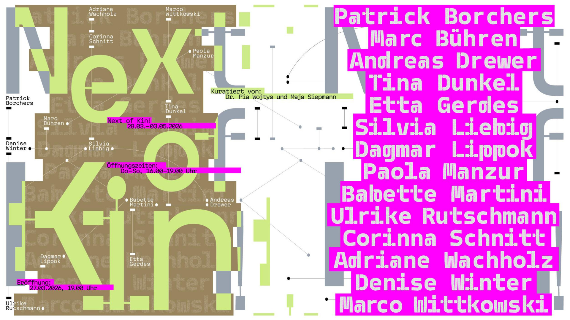 Met de tentoonstelling Next of Kin! richt het Künstler*innenhaus Dortmund de blik op posities uit zijn uitgebreide netwerk: de KiNs – kunstenaars in het netwerk. Te zien zijn werken van begeleiders en medestanders die het huis gedurende vele jaren hebben ondersteund, gevormd en mede vormgegeven, maar wier werk tot nu toe slechts zelden samen te zien was.