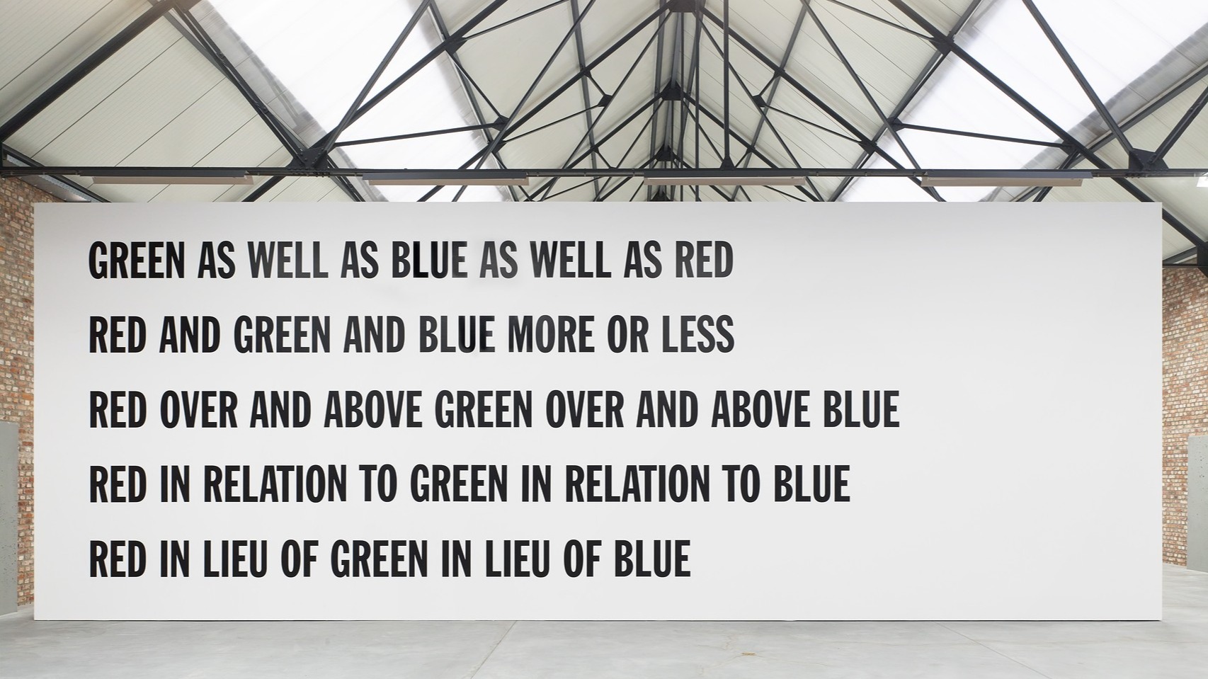RED AND GREEN AND BLUE MORE OR LESS is gewijd aan het werk van kunstenaar Lawrence Weiner (New York, 1942 – 2021) wiens oeuvre is opgebouwd rond de sculpturale mogelijkheden van taal.