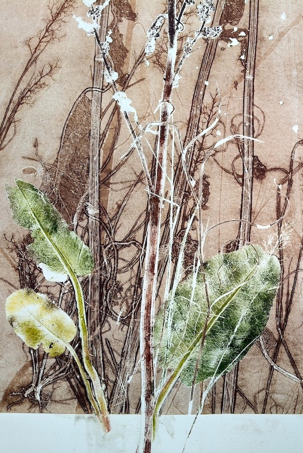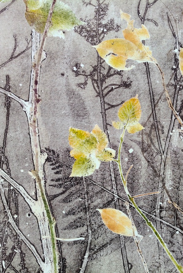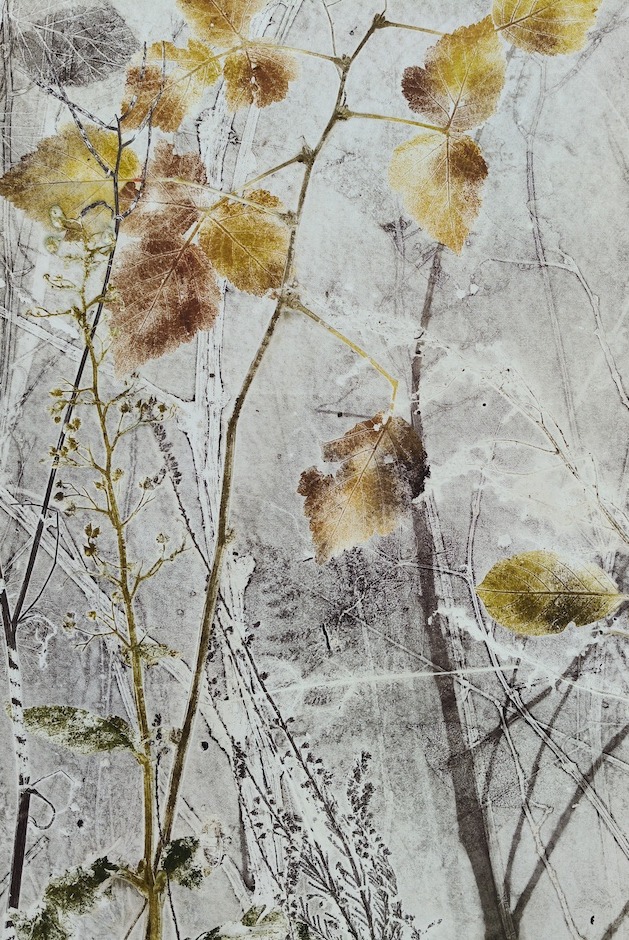 Tijdens wandelingen verzamelt zij materialen die in haar atelier een nieuw leven krijgen in (veelal groot) grafisch werk. Met een etspers drukt zij planten en takken in gelaagde composities, waarbij nerven en reliëf tastbaar blijven.