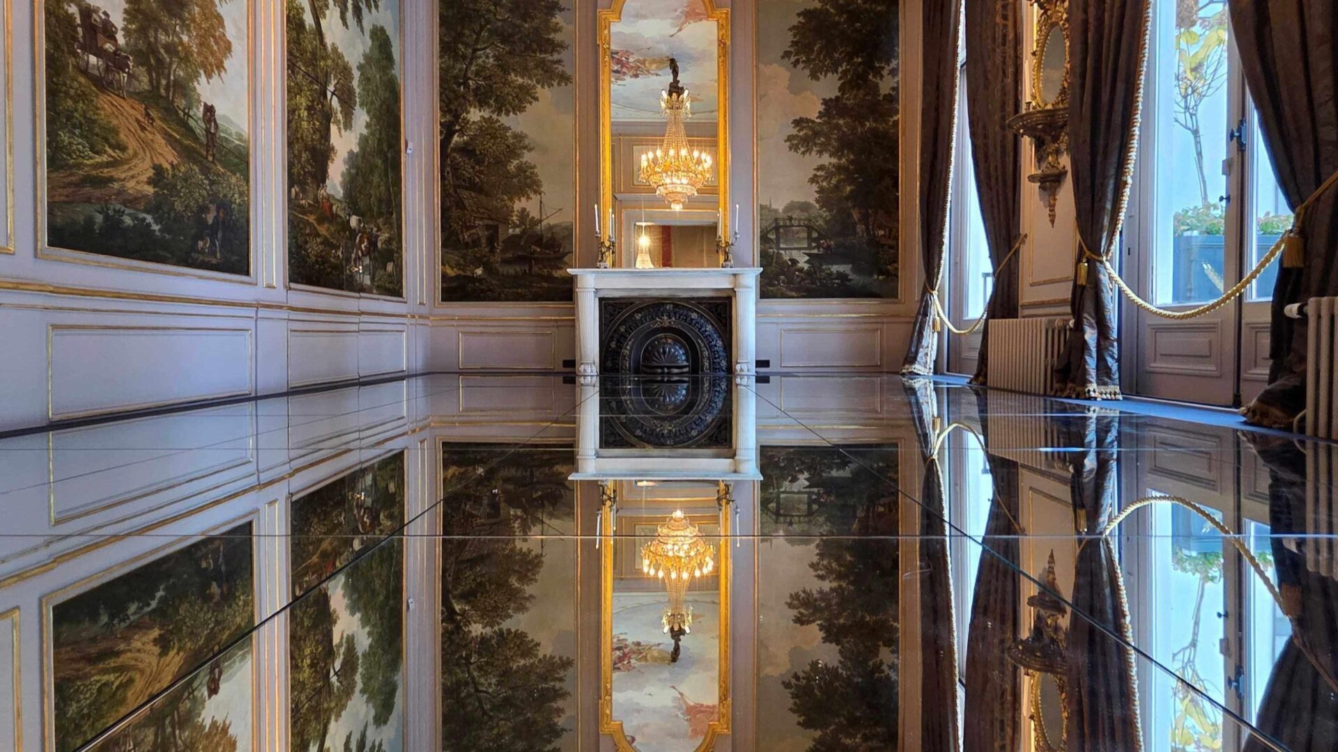 De vloer van de ‘Andriessenkamer’ op de bel-etage van ons 17de-eeuwse grachtenpand, is tijdelijk volledig bedekt met spiegels. In combinatie met de rijke wand- en plafondschilderingen is het net alsof je midden in een visuele illusie staat. De 18de-eeuwse wandschilderingen van Jurriaan Andriessen – een idyllisch landschap vol romantische details – ontmoeten de moderne plafondschildering Droom van verbondenheid (2022) van de Franse kunstenaar Pascal Amblard.
