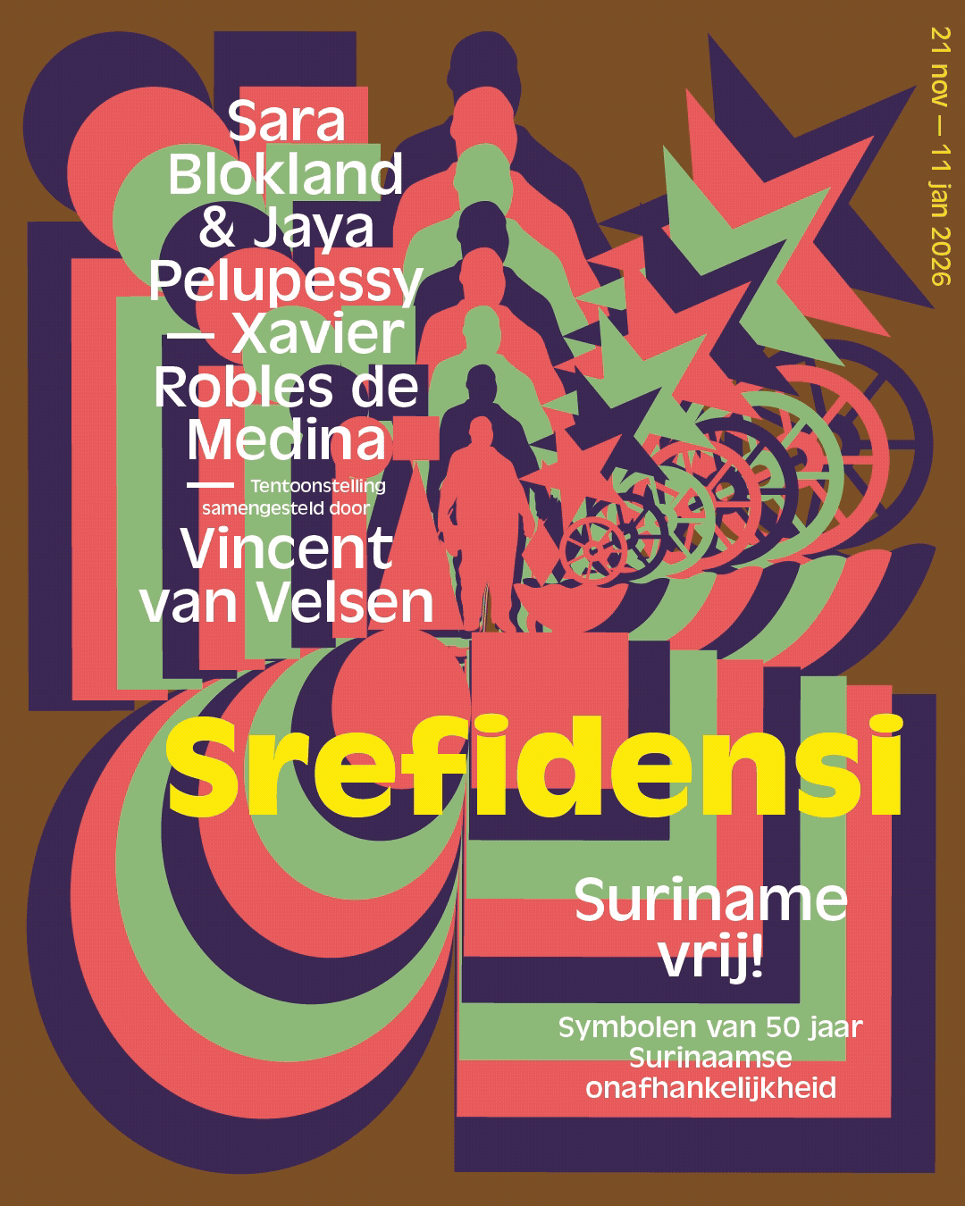 Framer Framed presenteert de tentoonstelling Srefidensi – Suriname vrij! Symbolen van 50 jaar Surinaamse onafhankelijkheid, met werk van kunstenaars Sara Blokland & Jaya Pelupessy en Xavier Robles de Medina, samengesteld door curator Vincent van Velsen. Vijftig jaar geleden, op 25 november 1975, werd Suriname onafhankelijk. Het jaar 1667 markeerde het begin van een 308 jaar durende koloniale overheersing, waarbij het Caribische land op het Zuid-Amerikaanse continent onder Nederlands bewind kwam. De tentoonstelling brengt twee projecten samen die zich richten op prominente symbolen van de Surinaamse Onafhankelijkheid: de nationale vlag en de totstandkoming van het standbeeld van de Surinaamse premier Johan Adolf Pengel.
