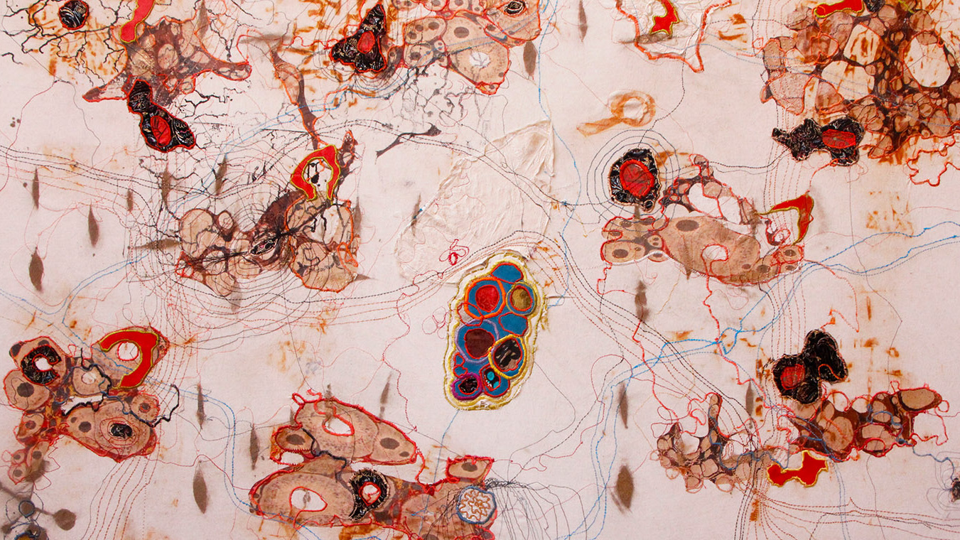 De textielwerken openen een veld van lijnen en knooppunten, alsof gedachtesporen, herinneringen of energetische routes zichtbaar worden gemaakt. Ze zijn kaarten van iets dat zich onttrekt aan het zichtbare; structuren die even goed binnen in ons bestaan als buiten ons. Sculpturen voegen daar een tastbare laag aan toe. Ze lijken restvormen van groei, condensaties van tijd, of organismen die onderweg een nieuwe gedaante hebben aangenomen.