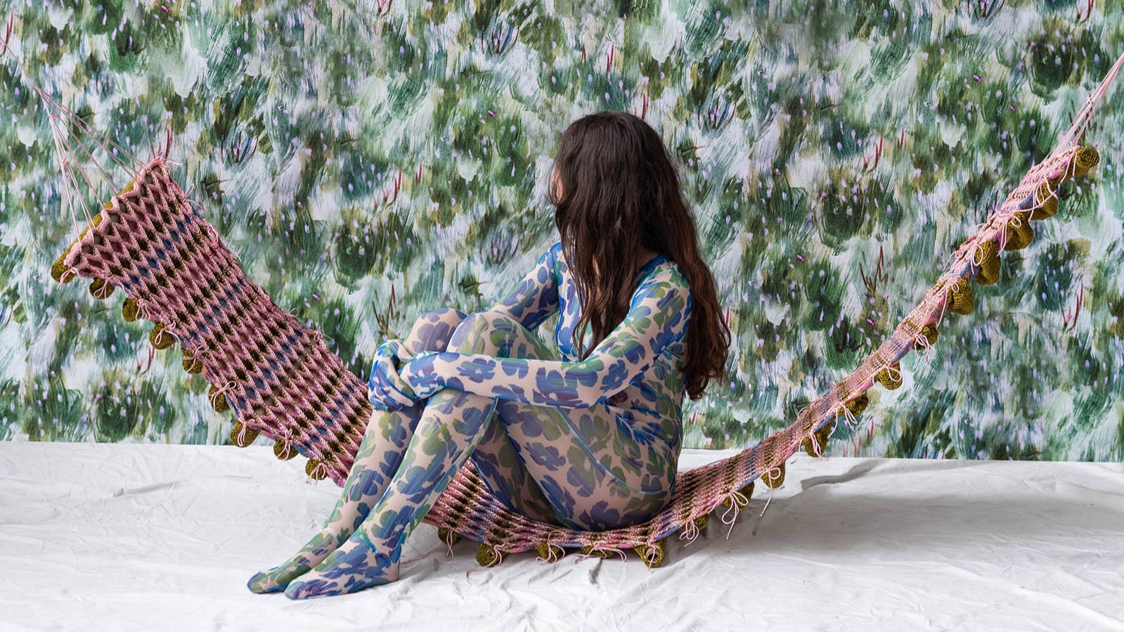 Het gebreide werk combineert vezels van katoen, linnen en zijde met gerecyclede synthetische materialen, zoals polypropyleen en polyethyleen. Elementen zoals zeilen, afdekkingen en netten worden hergebruikt en zijn in de objecten verwerkt. Bamboestokken en staal dienen als steunen en structurele elementen voor het textiel en doen denken aan het skelet van een kas.